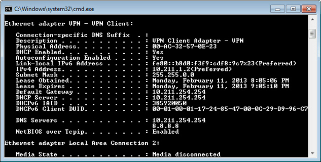 While a VPN connection is established, a Virtual Network Adapter on Windows will be created and the adapter will be assigned an IP address which begins with the "10.211." block. The default gateway address will be designated on the Virtual Network Adapter. You can confirm these network configuration by running "ipconfig /all" command on the Windows Command Prompt.